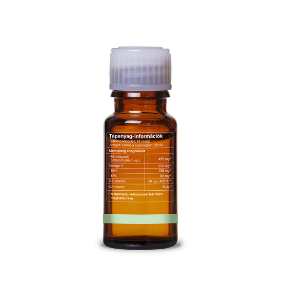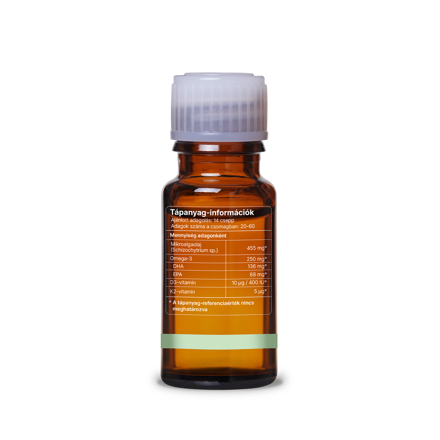 Egyedülálló formula, amely létfontosságú tápanyagokat tartalmaz: omega-3 zsírsavakat (DHA, EPA), ill. D3- és K2-vitamint, melyek nélkülözhetetlenek a gyermekek egészséges fejlődéséhez. Mindez természetes növényi forrásból.