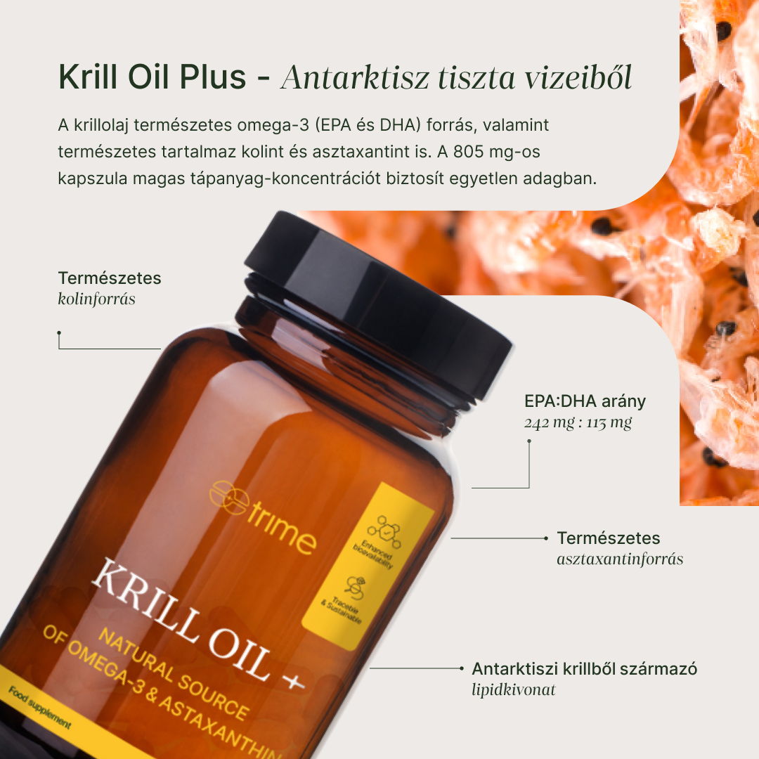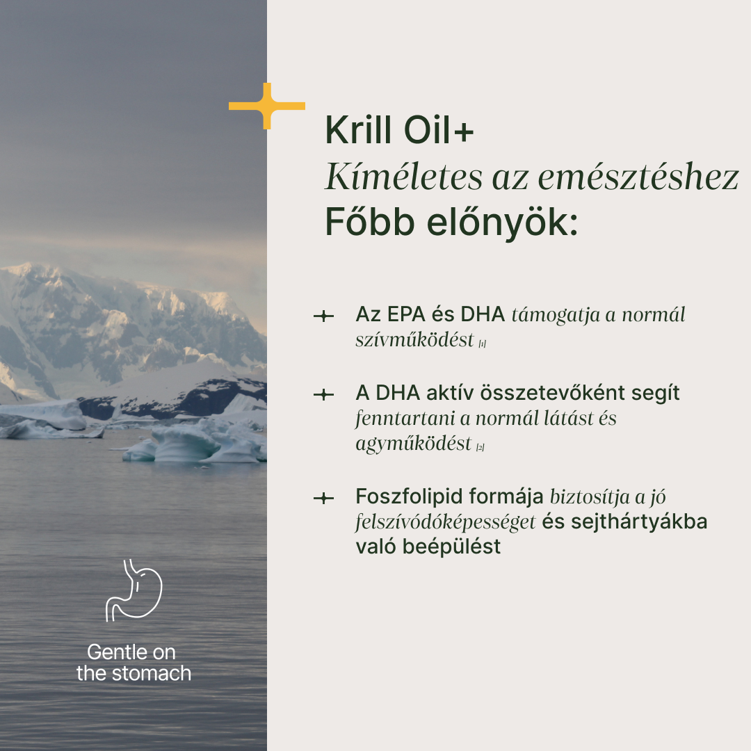 A Krill Oil+ kristálytiszta antarktiszi vizekből származik, MSC tanúsítvánnyal rendelkező halászatból, amely garantálja a fenntartható és környezetbarát működést. A krillolaj gazdag forrása az omega‑3 zsírsavaknak (EPA és DHA), emellett természetes formában tartalmaz asztaxantint és kolint is. Minden kapszula 805 mg krillolajat tartalmaz, biztosítva a magas tápanyagsűrűséget egyetlen adagban.