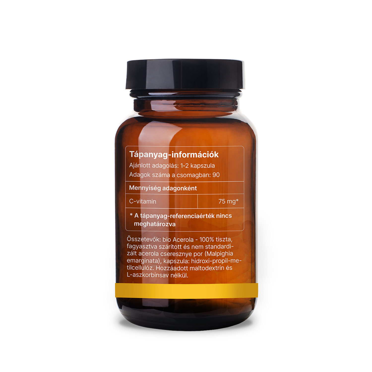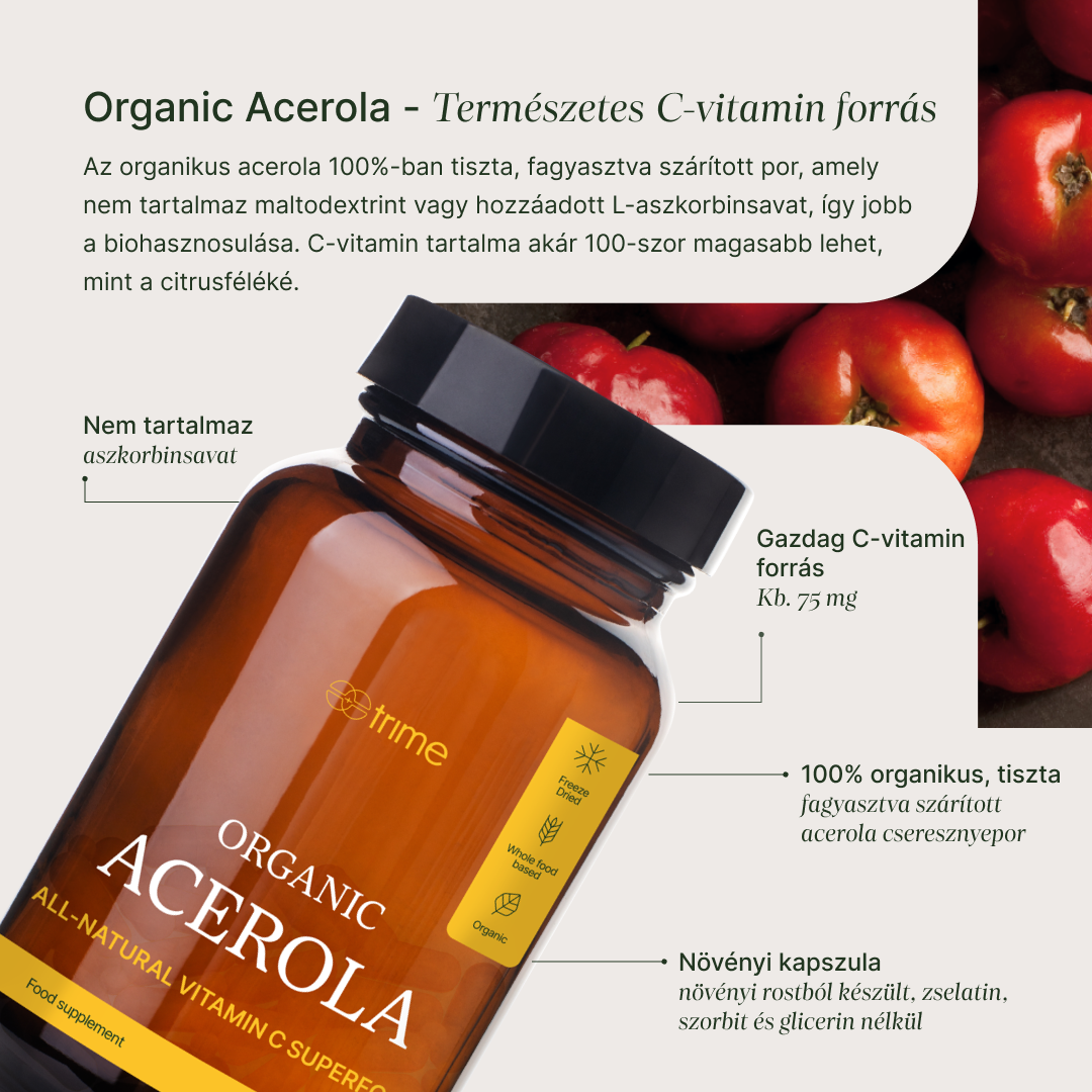 Organic Acerola kapszulánk 100%-ban természetes, fagyasztva szárított acerola port tartalmaz hozzáadott maltodextrin ill. l-aszkorbinsav nélkül, így akár 100-szor gazdagabb C-vitamin forrás, mint a narancs vagy a citrom.
